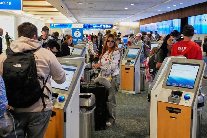 当地时间2025年11月11日,美国佛罗里达州奥兰多,奥兰多国际机场,乘客在美国航空公司自助值机柜台办理手续。视觉中国 图