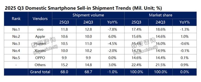 今年三季度,苹果已经重回国内手机市场前三名,借助iPhone17系列以及双11,四季度重新登顶也不是没有可能。