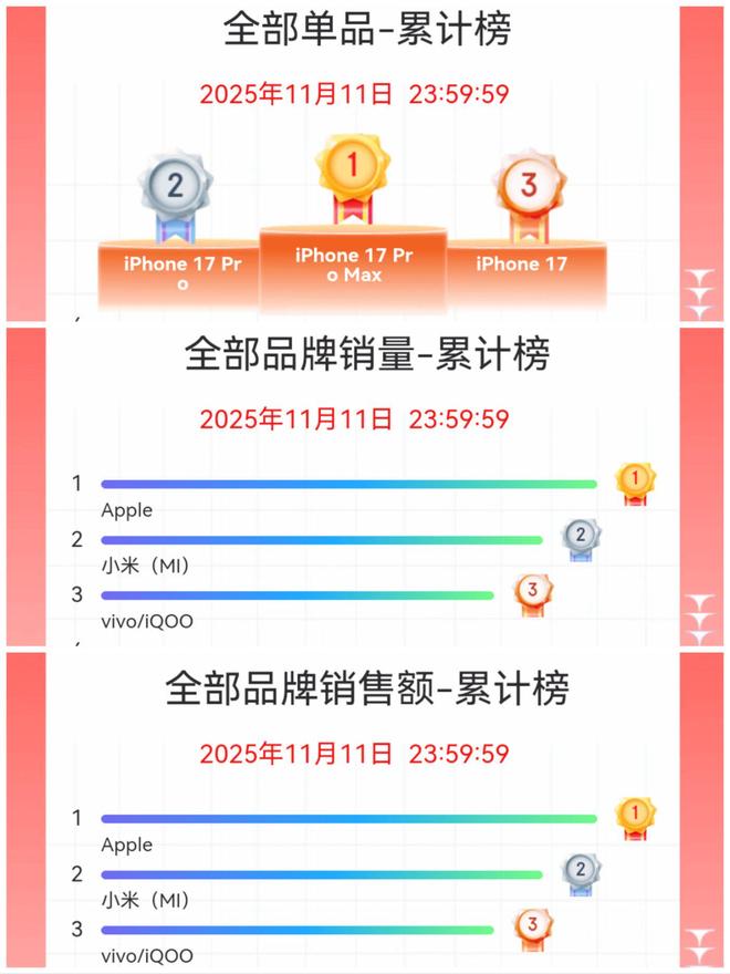 截至今天上午十点,未见到其它手机厂商的相关战报。需要指出的是,小米虽然公布了战报,但从成绩上来看,比去年的表现要差一些。2024年,小米全渠道累计金额破319亿元,要高于今年的成绩。当然,考虑到小米17系列是在9月份发布,有一部分需求是在双11之前就已经消耗,会对双11的成绩造成一定影响。