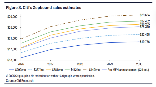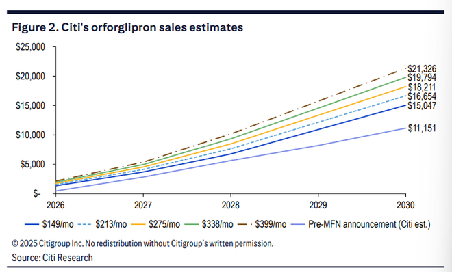 因此,尽管花旗维持了对Orforglipron在2030年以后超过400亿美元的峰值销售预期,但将2030年的销售额预测从之前的112亿美元大幅上调至182亿美元(市场共识为121亿美元)。