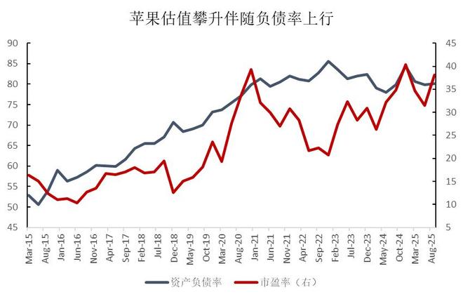 苹果实际上也采取了类似手段,其每年将大量的资金用于回购股票,2018财年以后,公司用于回购和分红的资金也基本与经营活动净现金流相当,同时,苹果的资产负债率也从2015财年的58.91%提升至2025财年的79.48%。