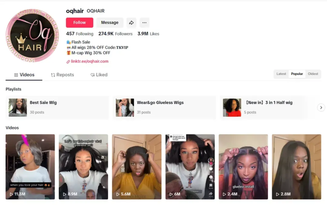 OQ Hair账号主页及部分达人推广视频 图片来源:网络