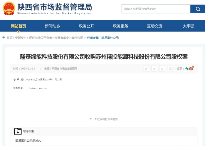 根据陕西省市场监督管理局发布的经营者集中简易案件公示,隆基绿能已与精控能源等相关方签署协议。交易完成后,隆基绿能将持有精控能源61.9998%的表决权,并取得单独控制权。