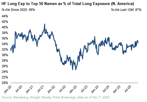 市场面临的一个核心风险在于,对冲基金和散户投资者的仓位都高度集中。根据MS PB Content的数据,对冲基金的多头杠杆水平处于过去五年来的第98个百分位,接近2006年以来的峰值。此外,其多头持仓的集中度也仅从近期高点小幅回落,仍处于过去一年中的第87个百分位。
