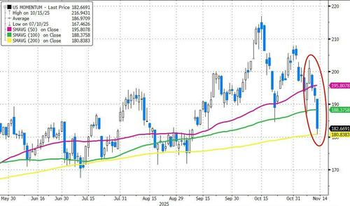这意味着,在总流入资金规模不变的情况下,流向市值较小、尚未盈利的投机性股票的资金正在减少。这种资金轮动已经对“散户青睐股”组合造成了冲击,该组合既包含大型科技股,也囊括了比特币矿商等投机性主题。自10月15日以来,该组合的表现已落后纳斯达克100指数约15%。如果散户资金流入放缓,或继续保持高度集中,即使没有出现大规模抛售,投机性较强和动量属性较重的股票也将持续承压。
