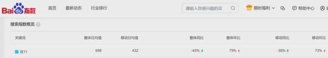 "体感温度"上,2025年的双十一不高,公共平台上的关注度也差强人意——11月11日、11月12日这两天,微博热搜上没有一条与之相关的登顶内容,百度指数上的"双11"关键词显示,整体同比下降43%,移动同比下降36%。