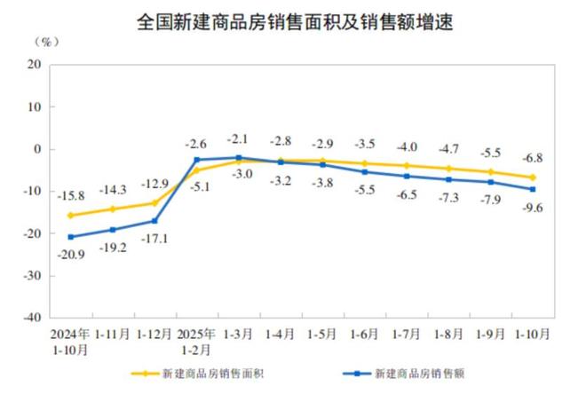 11月14日,国家统计局发布《2025年1-10月份全国房地产市场基本情况》,数据显示,全国房地产市场继续延续调整态势,1-10月,全国新建商品房销售面积同比下降6.8%,销售额同比下降9.6%。
