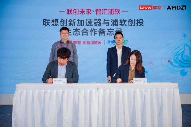 现场,联想创新加速器负责人宋昊浦软创投负责人李佳姝,联想集团副总裁、联想研究院个人计算实验室负责人王哲鹏上海浦东软件园副总经理、浦软创投董事长童剑飞的见证下正式签署生态合作备忘录。