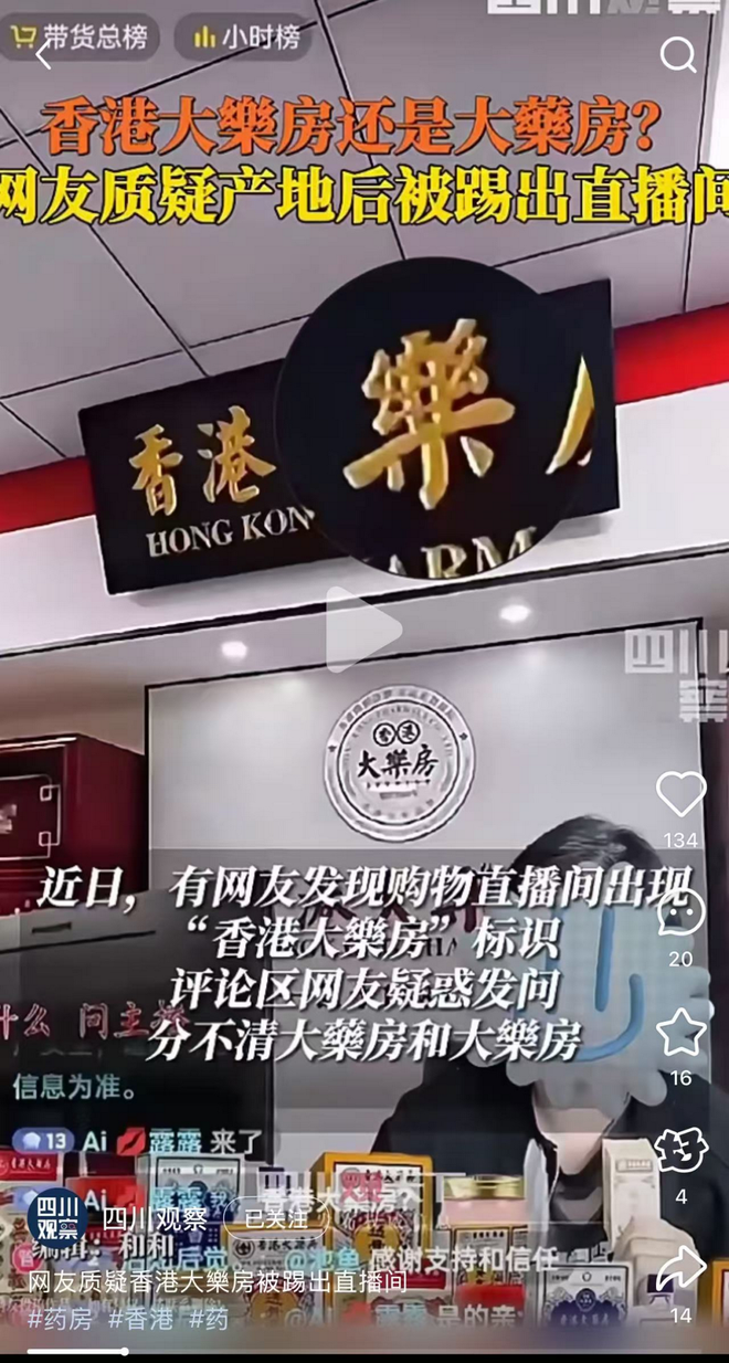 据羊城网报道,很多商家会以"香港大药房"之名冒充香港百年老字号,大肆制造并销售冒牌药品,相关直播间还会露出"香港大药房"的门店牌匾作为背书。有意思的是,一些主播因为不认识繁体字,错将背景的"香港大药房"写成"香港大乐房",令人啼笑皆非。