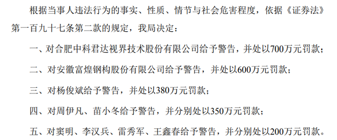 读创财经注意到,在违法事实、违法行为对应的法律依据,拟处罚/最终处罚细节等多方面,富煌钢构刚收到的《行政处罚决定书》,与公司此前收到的行政处罚事先告知书的主要内容基本一致。若具体计算的话,富煌钢构、中科视界两家公司及相关人员,将面临3180万元的巨额罚单。