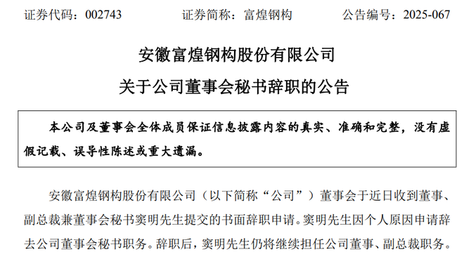 11月14日晚间,富煌钢构还发布了公司董秘辞职的公告。公司董事会于近日收到董事、副总裁兼董事会秘书窦明提交的书面辞职申请。窦明因个人原因申请辞去公司董事会秘书职务。辞职后,窦明先生仍将继续担任公司董事、副总裁职务。截至本公告披露日,窦明未持有公司股份,亦不存在应当履行而未履行的承诺事项。窦明在任职期间恪尽职守、勤勉尽责,公司董事会对窦明为公司所作出的贡献表示衷心感谢!为保证公司董事会工作的正常运行,根据有关规定,在公司正式聘任董事会秘书之前,由公司董事兼总裁郑茂荣代为履行董事会秘书职责,公司将按照相关规定尽快选聘新的董事会秘书。