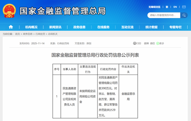 11月14日,金融监管总局行政处罚信息公开表显示,民生通惠资产管理有限公司(简称“民生通惠资管”)因未按照规定运用保险公司资金被罚款390万元。