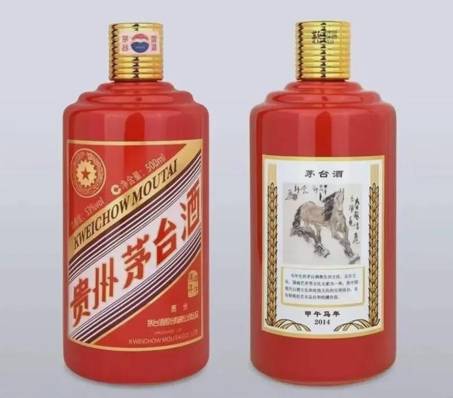 贵州茅台首款马年生肖酒可谓开创了生肖酒符号的先河——瓶身通体红色,体现马年五行火属性;瓶盖篆刻金色"甲午马年"印章,瓶身浮雕三匹骏马;背标上印有徐悲鸿弟子刘勃舒的《春风得意马蹄疾》一画。生肖图腾、名家画作、五行哲学在同一瓶酒上实现融合。