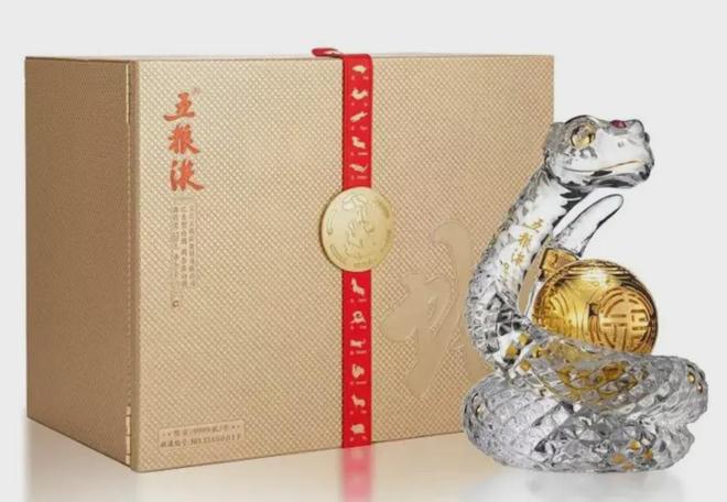 在瓶型上,五粮液与珍酒则展开了另一场视觉较量。五粮液乙巳蛇年生肖酒采用玻璃动物瓶型,以象形文字"巳"为灵感,锻造出"灵蛇抱五福珠" 的造型,象征五福临门;珍酒的"错金蛇"形象则取自三星堆青铜蛇藏品,融合了历史文物、非遗文化与生肖图腾。