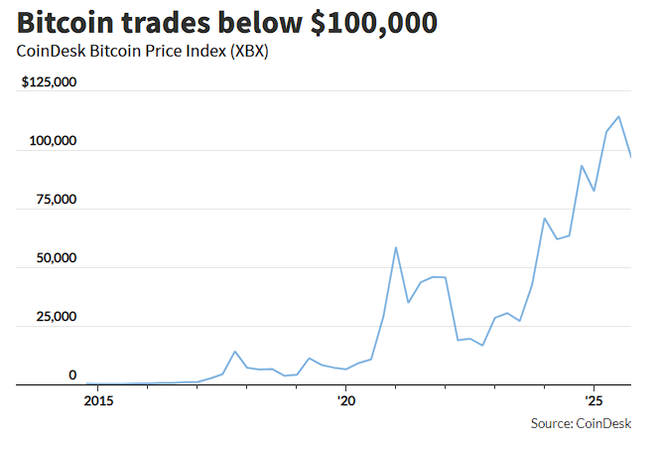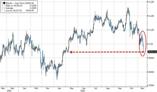 然而,比特币却完全没有参与这场反弹盛宴。周五比特币下跌5%,最低触及94519美元,为5月6日以来最低点,全周跌幅达9.14%,创下自2月28日当周以来最差单周表现。自10月5日触及126272美元的历史高点以来,比特币已累计下跌约25%。