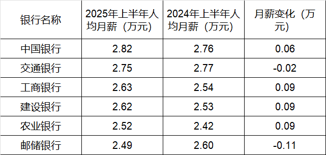 其中,中国银行上半年人均月薪为2.82万元,交通银行为2.75万元,工商银行、建设银行分别为2.63万元、2.62万元,农业银行、邮储银行分别为2.52万元和2.49万元。