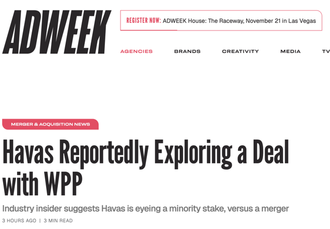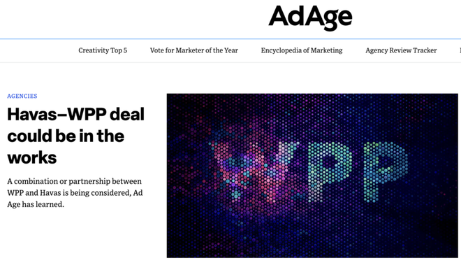 11月15日,根据AdAge、ADWEEK的报道,法国广告集团Havas正在酝酿一笔针对WPP的交易。