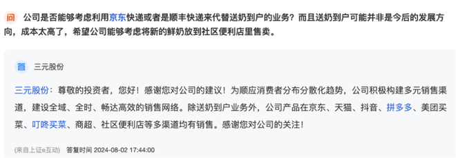 投资者曾经询问三元股份,是否考虑用京东快递或者顺丰代替送奶到户,或者放到社区便利店。