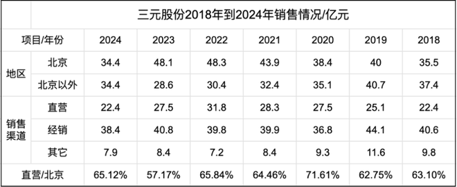 2018到2023年北京地区的销售额分别是35.5亿元、40亿元、38.4亿元、43.9亿元、48.3亿元、48.1亿元,到了2024年直线下滑到了34.4亿元。