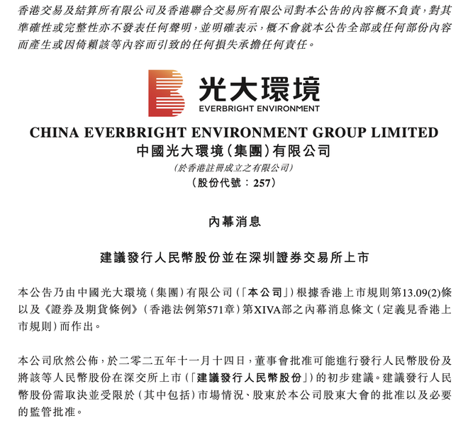 近日,光大环境(00257.HK)发布公告,公司董事会批准可能进行发行人民币股份及将该等人民币股份在深交所上市的初步建议。建议发行人民币股份需取决并受限于(其中包括)市场情况、股东于公司股东大会的批准以及必要的监管批准。