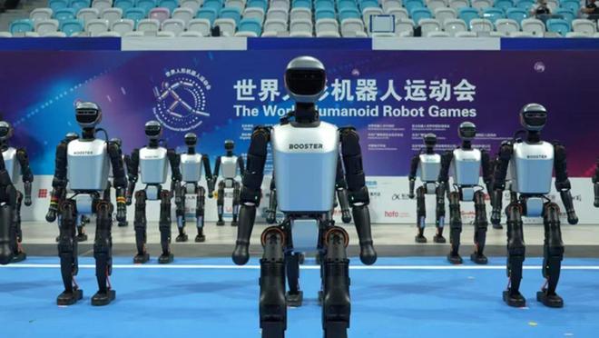 图注:今年8月,25台Booster T1亮相世界人形机器人运动会开幕式,在全球观众面前完成史上第一个机器人自主行走方阵。