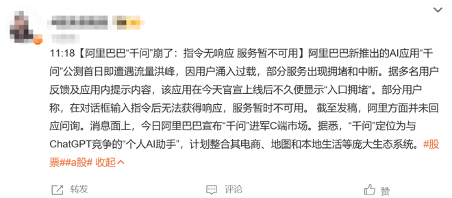 新推出的AI应用“千问”公测首日即遭遇流量洪峰,因用户涌入过载,部分服务出现拥堵和中断。
