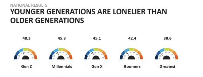 根据Cigna的一项调查,Z世代(18-22岁)的平均孤独感得分为48.3,在各个世代中排名第一,被称为“最孤独的一代”。报告也指出,各世代的孤独得分随年龄下降而逐渐升高。