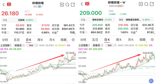 受业绩利好提振,财报发布当日 B 站美股盘前涨幅一度超 6%;近半年,B 站美股、港股均实现累计涨幅超 85%,最高上涨峰值超过 125%。