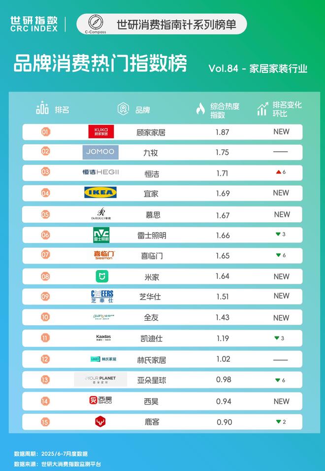 本次监测周期内,顾家家居、九牧和恒洁分别以1.87、1.75和1.71的综合热度位列榜单综合热度前三。