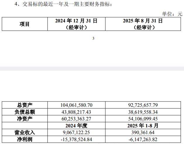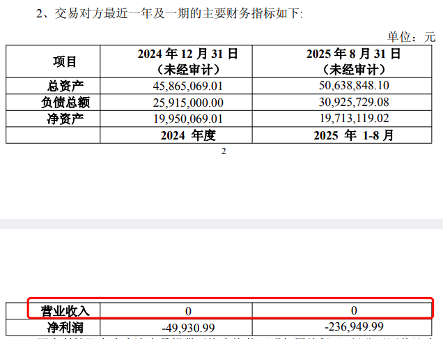 公告显示,同享科技成立于2024年1月,注册资本2000万元,但其2024年及2025年1-8月的营业收入均为零。净利润持续为负,2024年度亏损4.99万元;2025年1月-8月,亏损进一步扩大至23.69万元。