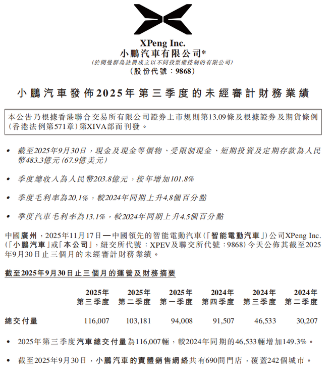 第三季度汽车总交付量为116,007辆,较2024年同期的46,533辆增加149.3%。截至2025年9月30日,小鹏汽车的实体销售网络共有690间门店,覆盖242个城市;小鹏汽车自营充电站网络达至2,676座充电站,包括1,623座小鹏S4及S5超快充站。