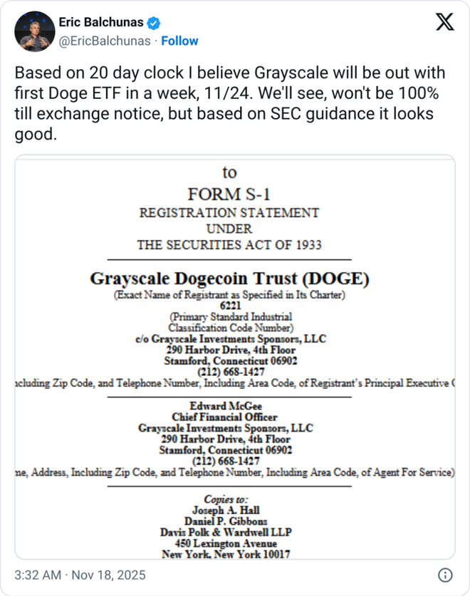 与此同时,备受关注的狗狗币ETF也已箭在弦上。据彭博ETF分析师Eric Balchunas表示,Grayscale旗下的狗狗币ETF可能最早于11月24日推出,有望成为美国首个直接持有该加密货币的ETF。Bitwise的现货狗狗币ETF也可能在下周晚些时候面世。