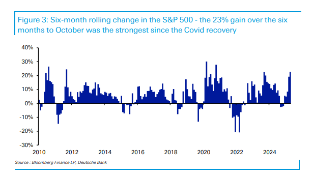 数据显示,在截至10月的六个月里,标普500指数的滚动涨幅达到了23%,这是自2020-21年新冠疫情复苏以来的最强表现。