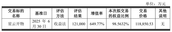 截至评估基准日,星云开物100%股权评估值为12.10亿元,增值率高达649.77%。经交易各方协商,星云开物98.5632%股权的整体交易作价为11.89亿元,对应标的资产全部股东权益交易作价为12.06亿元。
