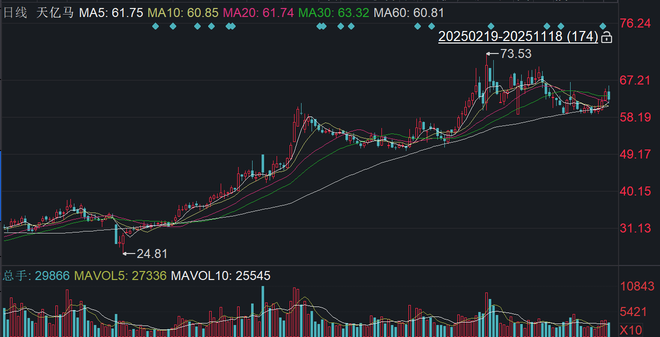 二级市场上,截至11月18日收盘,天亿马下跌3.14%报62.30元/股,总市值约41.65亿元,今年来公司股价累计上涨123%。