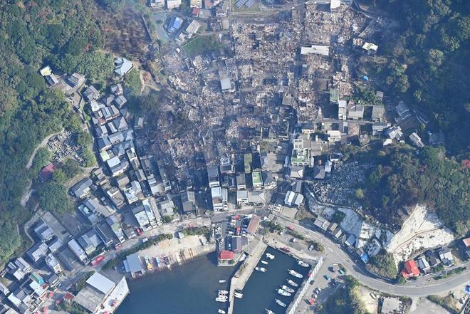 当地时间2025年11月19日,日本大分县大分市,航拍画面显示火灾现场。火灾于18日晚间发生,并蔓延至170多栋建筑。视觉中国 图