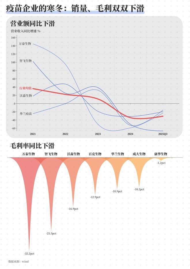 需求疲软与价格下行叠加,使企业盈利能力持续承压。数据显示,七家头部疫苗企业净利率平均下降约46个百分点,其中三家已出现亏损。