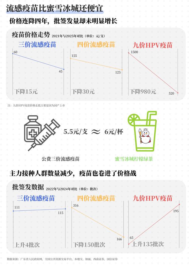 今年公费三价流感疫苗在部分省份中标价低至5.5元/支,刷新历史新低。业内人士指出,这一现象折射出疫苗行业整体进入“降价周期”。