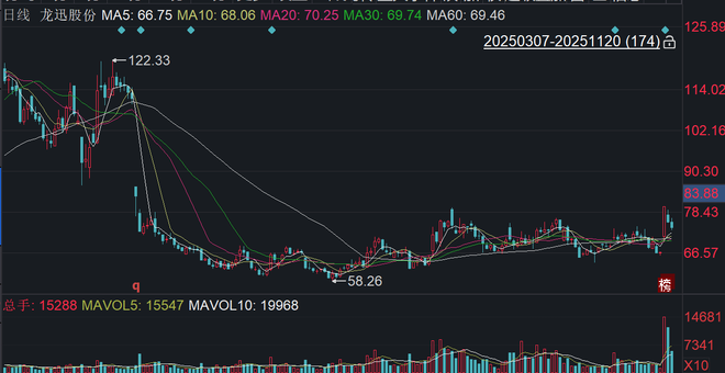 二级市场上,截至11月20日收盘,龙迅股份下跌2.14%报73.54元/股,总市值约98.05亿元,今年来公司股价累计上涨约两成。