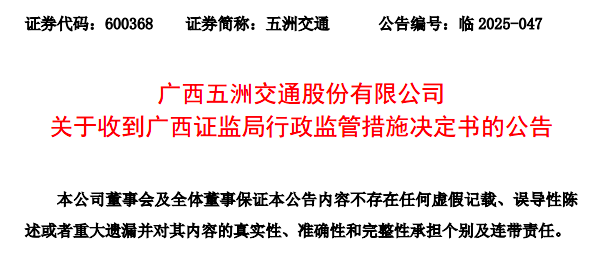 五洲交通因财务核算及信披违规,接连收到广西证监局行政监管措施决定书,以及上交所监管警示函, 四名时任高管同步被追责。