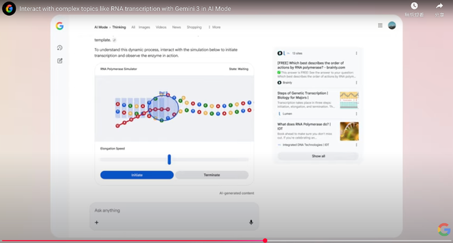 简单来说,Gemini 3 Pro 具有“原生多模态”特性,它可以同时处理文本、图像和音频,传统的文本-文本的单一交互状态得到了提升,编码功能的增强也使其能够生成更好的视觉效果。在谷歌的官方演示中,AI 对RNA进行了加工处理,整体表现得很流畅。