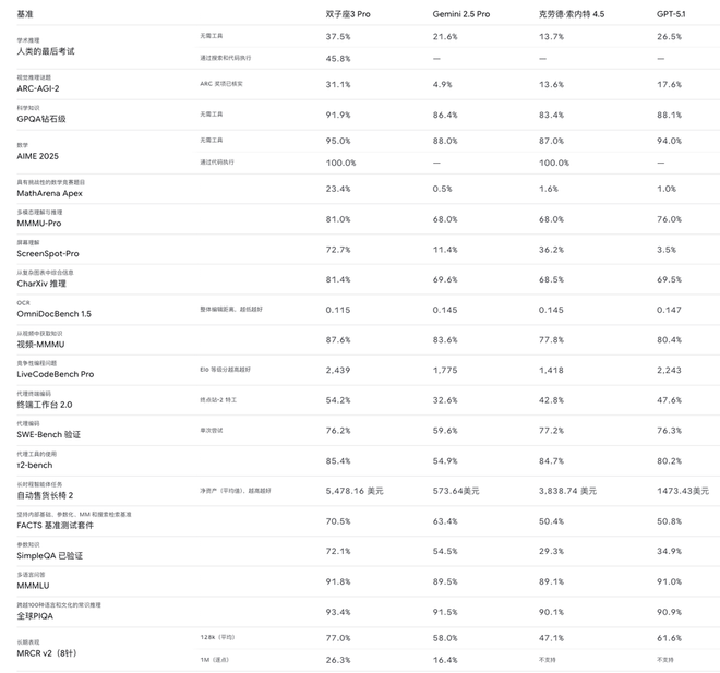 谷歌试图表达,Gemini 3 Pro 在标准化知识生成、AI工具使用乃至“人工智能”这几个重要指标方面,具有全方位的优势。