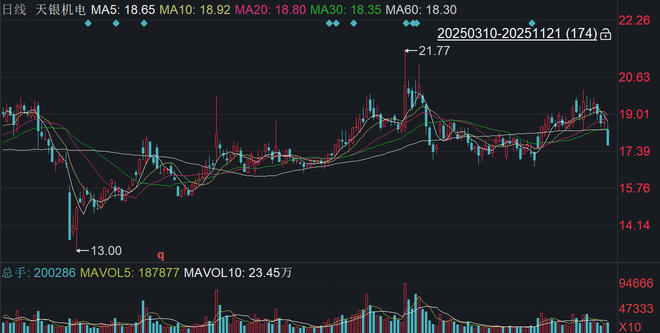 二级市场上,截至11月21日收盘,天银机电下跌5.48%报17.61元/股,总市值约74.85亿元,今年来公司股价累计上涨约8%。