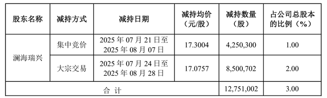 7月21日至8月28日,澜海瑞兴同样因经营发展资金需要,以集中竞价交易方式和大宗交易方式合计减持公司股份1275万股,占公司总股本比例3%。
