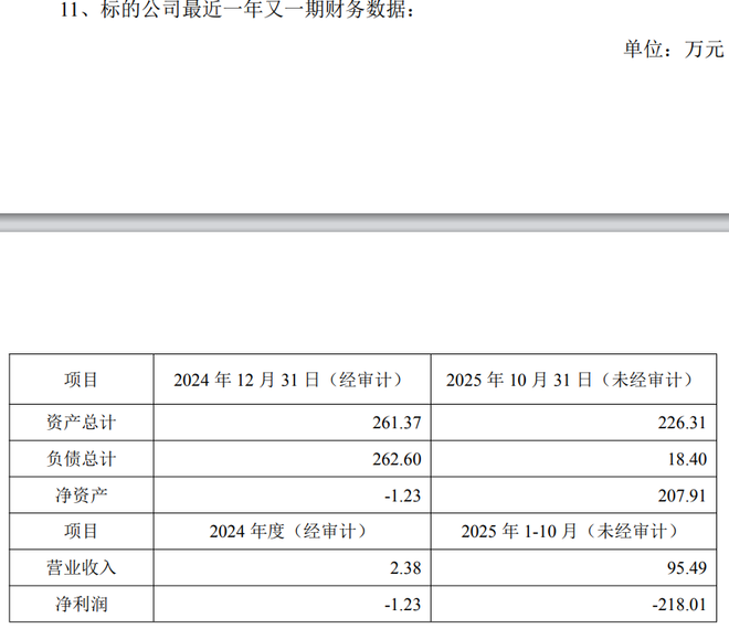 从公告所列数据看,灵掌机器人财务数据难言乐观:2024年全年营收仅2.38万元,亏损1.23万元;2025年1—10月营收95.49万元,亏损扩大至218万元。截至10月末,公司资产226万元,负债18.40万元,净资产208万元,刚刚由负转正。