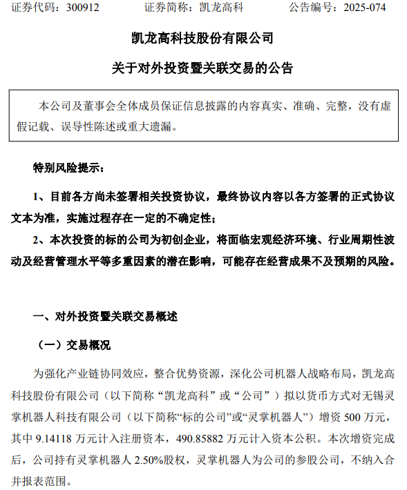 11月21日晚间,凯龙高科(300912)公告称,为强化产业链协同效应,整合优势资源,深化公司机器人战略布局,公司拟以货币方式对无锡灵掌机器人科技有限公司(以下简称“标的公司”或“灵掌机器人”)增资500万元。本次增资完成后,公司持有灵掌机器人2.50%股权,灵掌机器人为公司的参股公司,不纳入合并报表范围。
