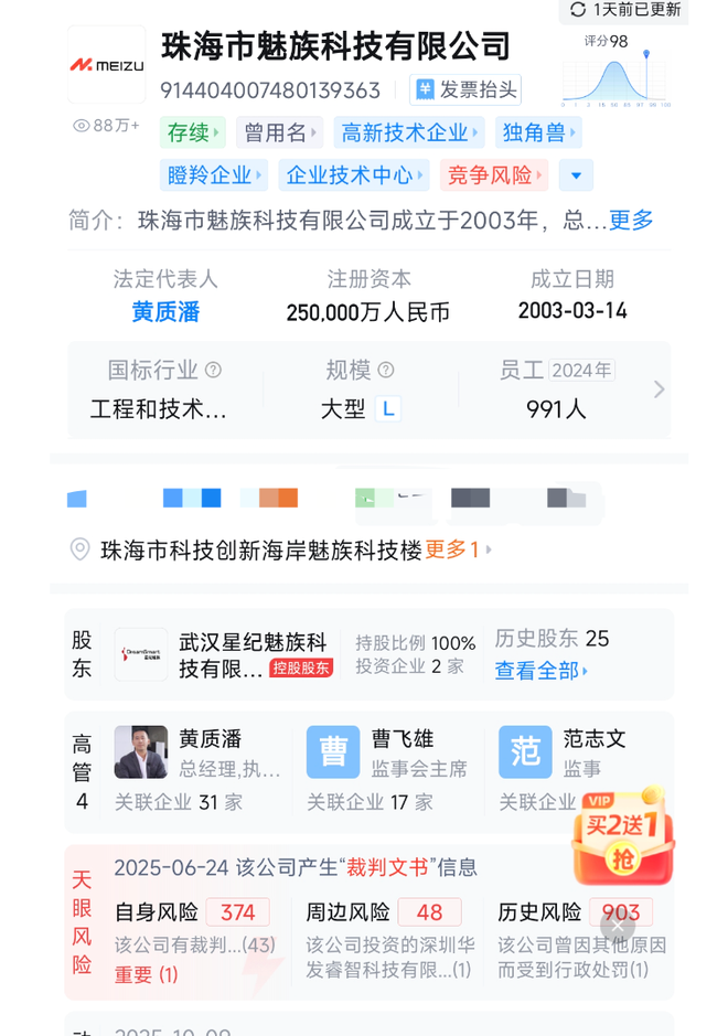 根据天眼查截至2025年11月21日数据显示,魅族科技自身风险已经高达374条,周边风险48条,历史风险达到903条。司法案件有573条,涉诉关系有254条,其中49.8%为被告,多涉及侵害作品信息网络传播权纠纷、侵害商标权、广告合同纠纷等。目前开庭公告143条。这些法律风险或将持续消耗其品牌信誉。