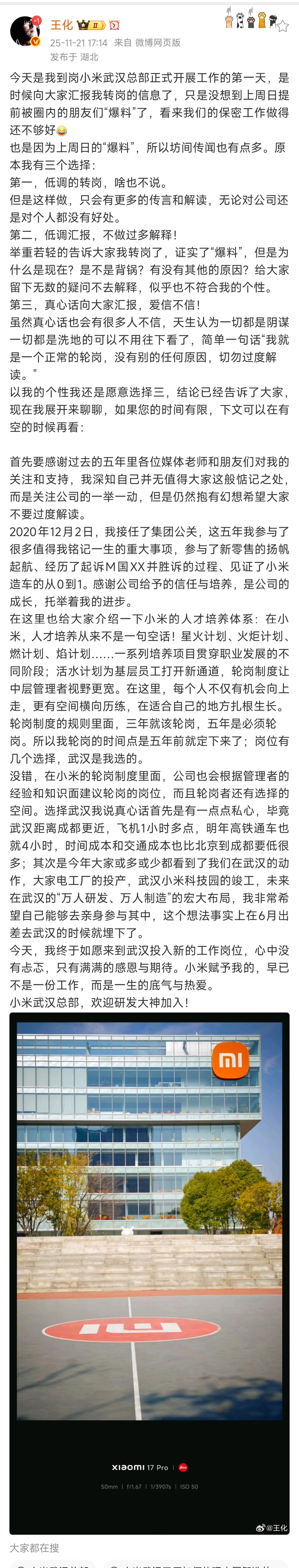 11月21日,小米集团公关部总经理王化在社交平台发文确认转岗小米武汉总部。