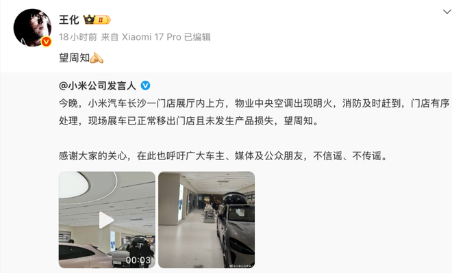 声明中强调,门店有序处理,现场展车已正常移出门店且未发生产品损失。王化还转发了“小米公司发言人”的微博回应。