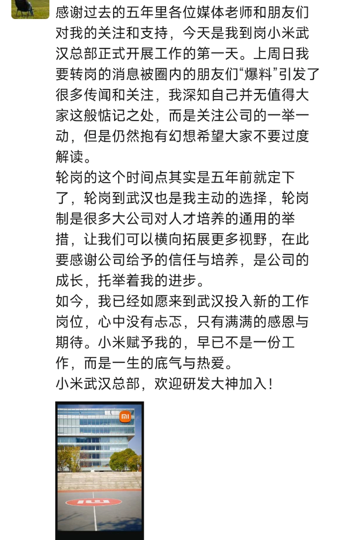 他在社交平台上指出,今天是自己到岗小米武汉总部正式开展工作的第一天。上周日自己要转岗的消息被圈内的朋友们“爆料”引发了很多传闻和关注,深知自己并无值得大家这般惦记之处,而是需要关注公司的一举一动。